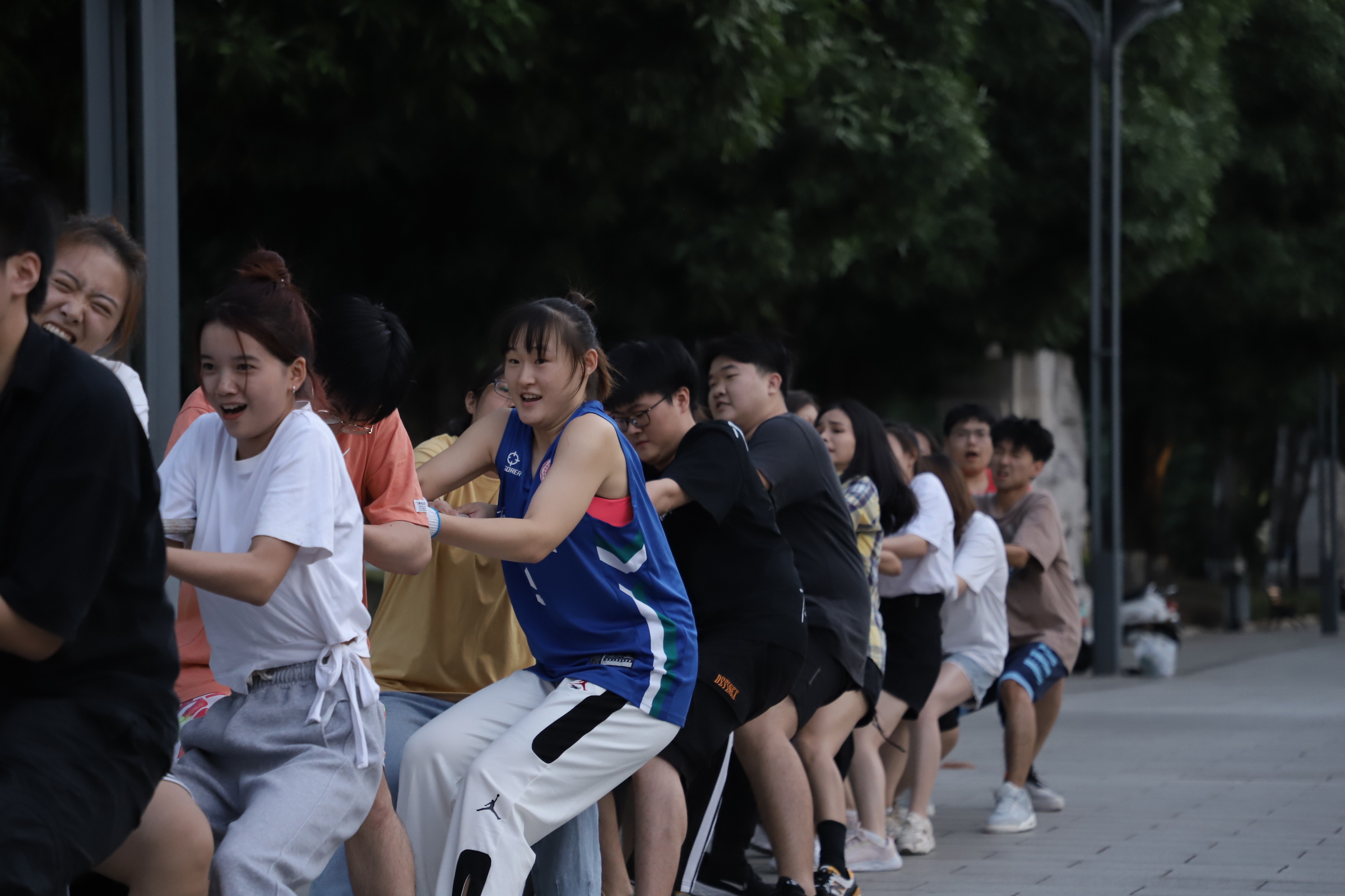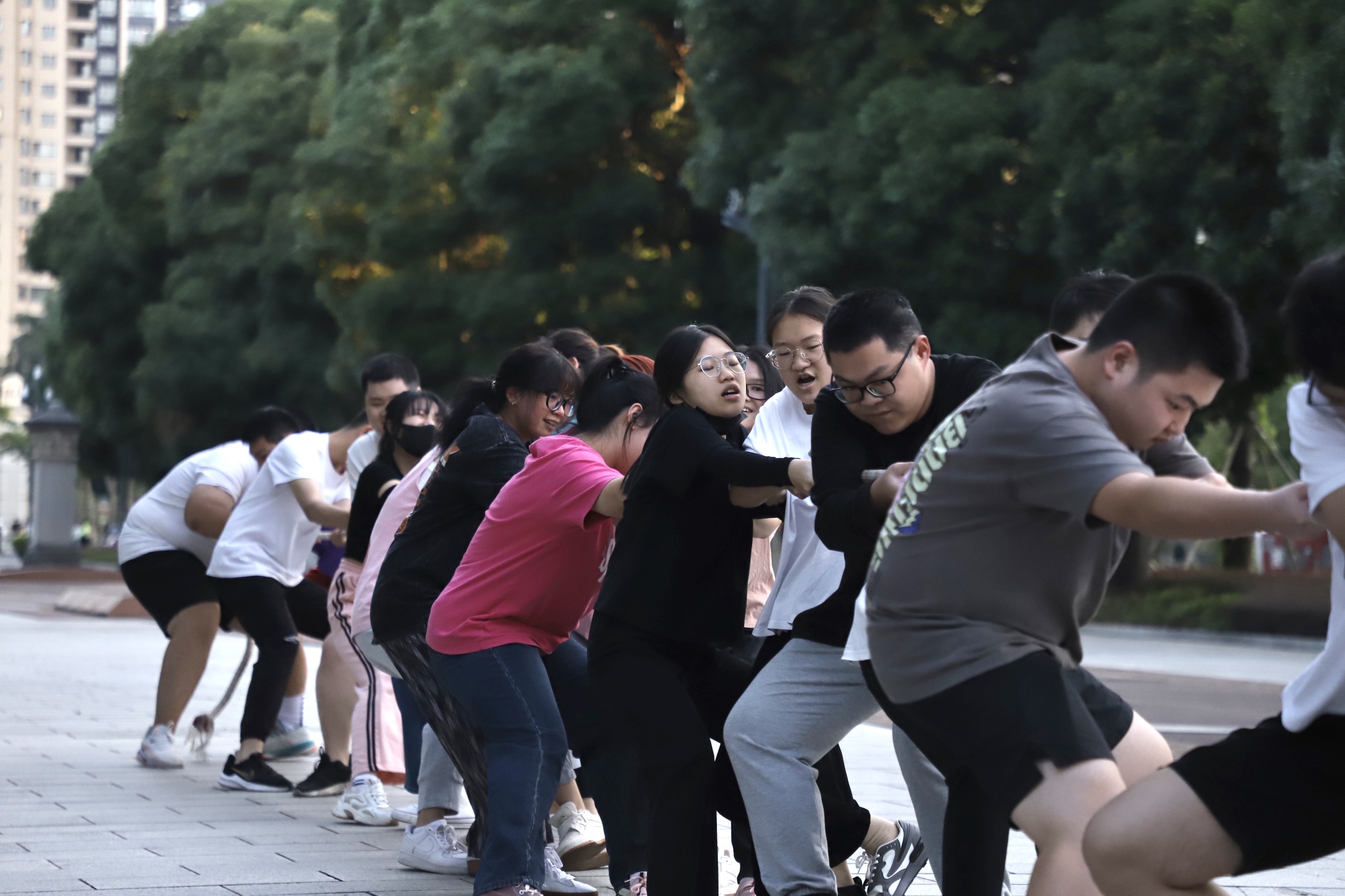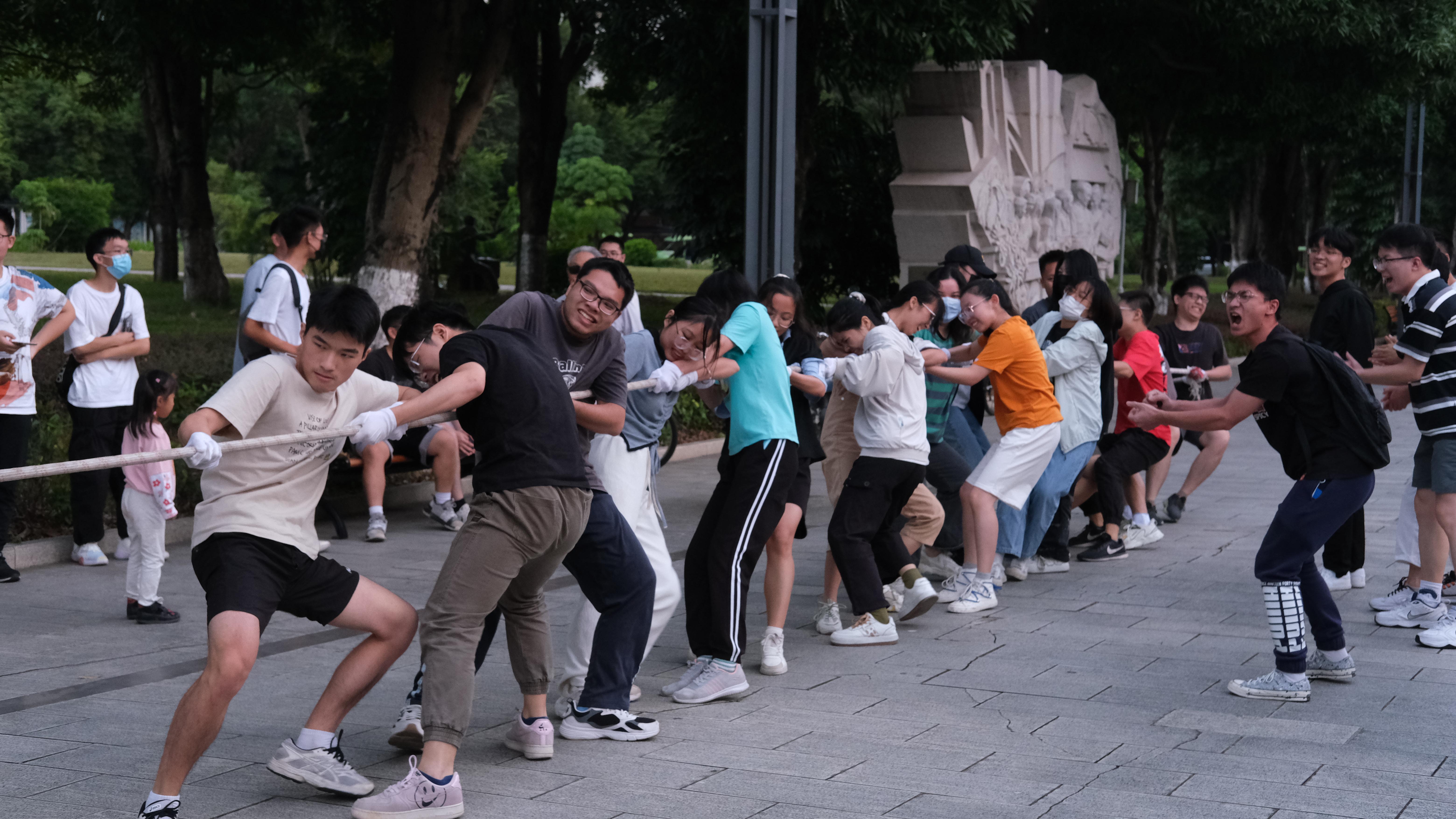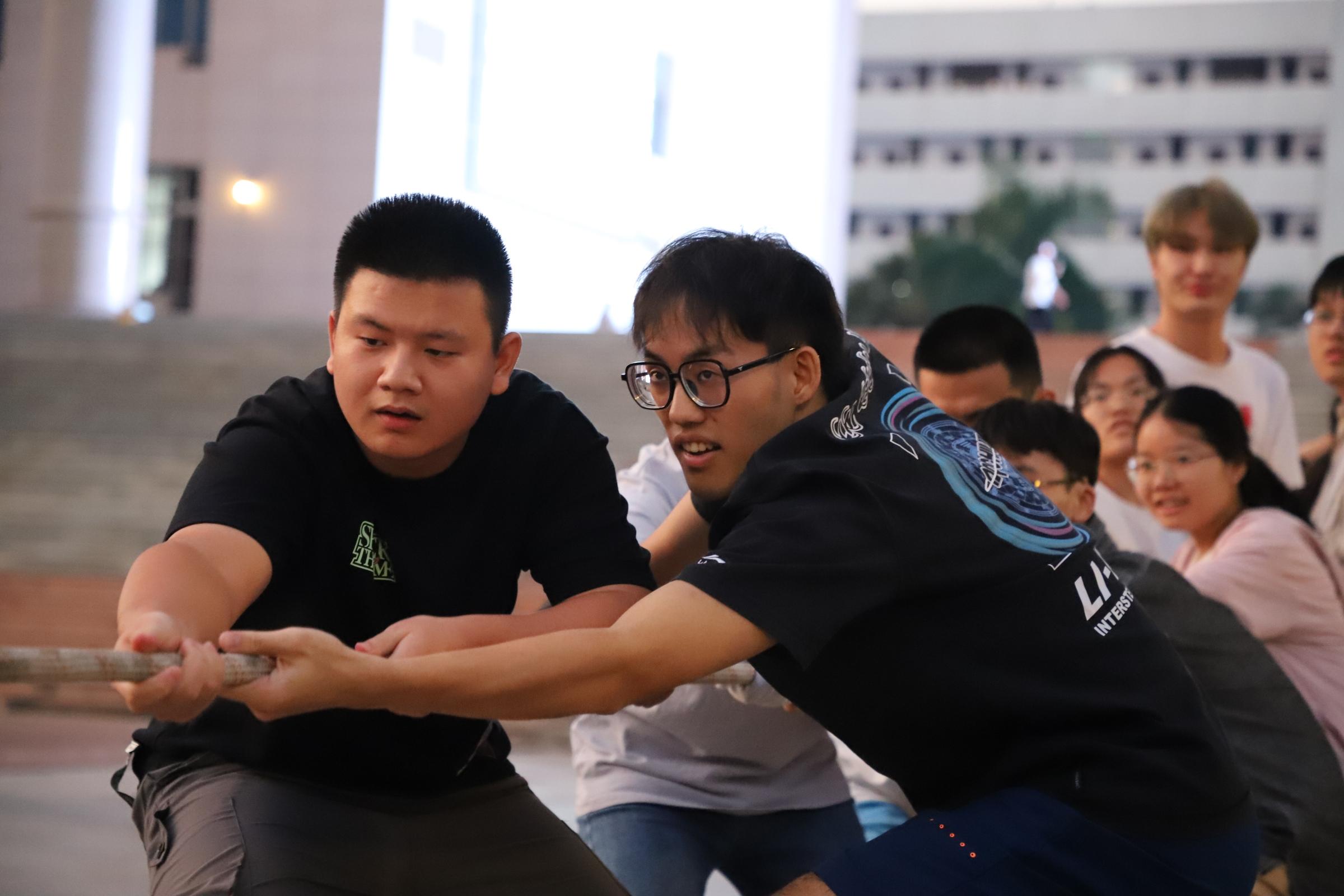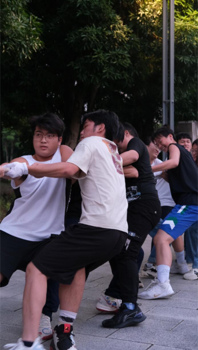 待到选手们戴好手套,站好队形,身子向后仰,脚弯成弓步,这场秋日里的激情对决正式拉开序幕。“3—2—1—嘀—”随着裁判吹响口哨,双方选手立刻卯足了劲,向后倒,往后拉,心往一处想,力往一处使。红绳在区间内来回移动,选手们在比赛中接受体力与意志力的考验。场边加油助威的同学们也不甘示弱,卖力的呐喊高呼汇成了轰轰烈烈的青春交响乐。