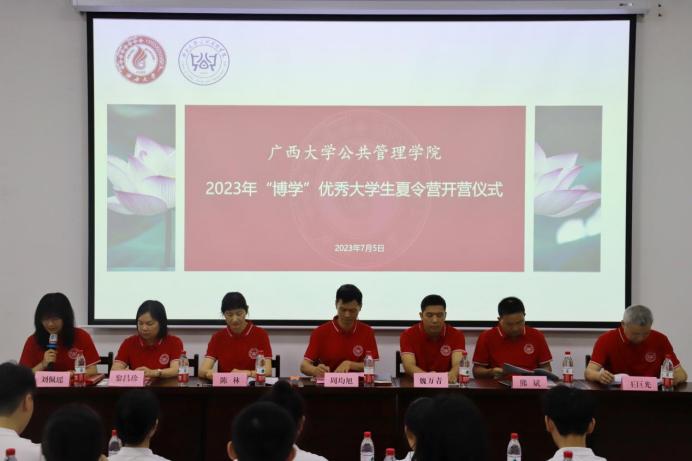7月5日上午,广西大学beats365亚洲版2023年优秀大学生“博学”夏令营正式拉开帷幕。学院副院长周均旭、副院长魏万青、副院长陈林、MPA教育中心副主任熊斌、公共管理系黎昌珍教授和王巨光教授出席了本次开营仪式。此次夏令营以“线上+线下”的形式开展。