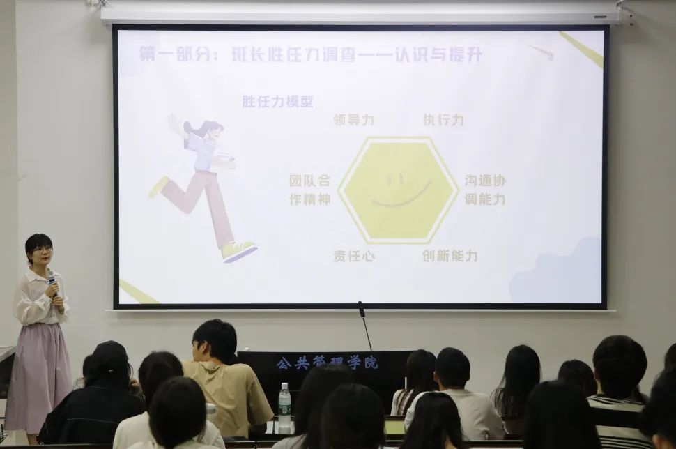 刘佩瑶以班长胜任力模型引入,通过班长自评和同学侧评,引导班长在领导力、执行力、责任心、沟通协调能力等方面进行自检思考,为各位班长就“如何能履行好班长这一职责”切实找到进步成长的具体路径。