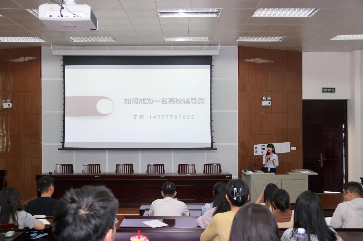 讲座伊始,于丹老师以讲故事的方式从求职经历、获得奖项和近期工作三个方面对自己进行简单介绍。接着她从“为什么要选择辅导员这份职业”、“如何让自己更有优势”、“笔试经验分享”、“面试案例分析经验分享”以及“理论宣讲经验分享”五个模块展开自己的分享。