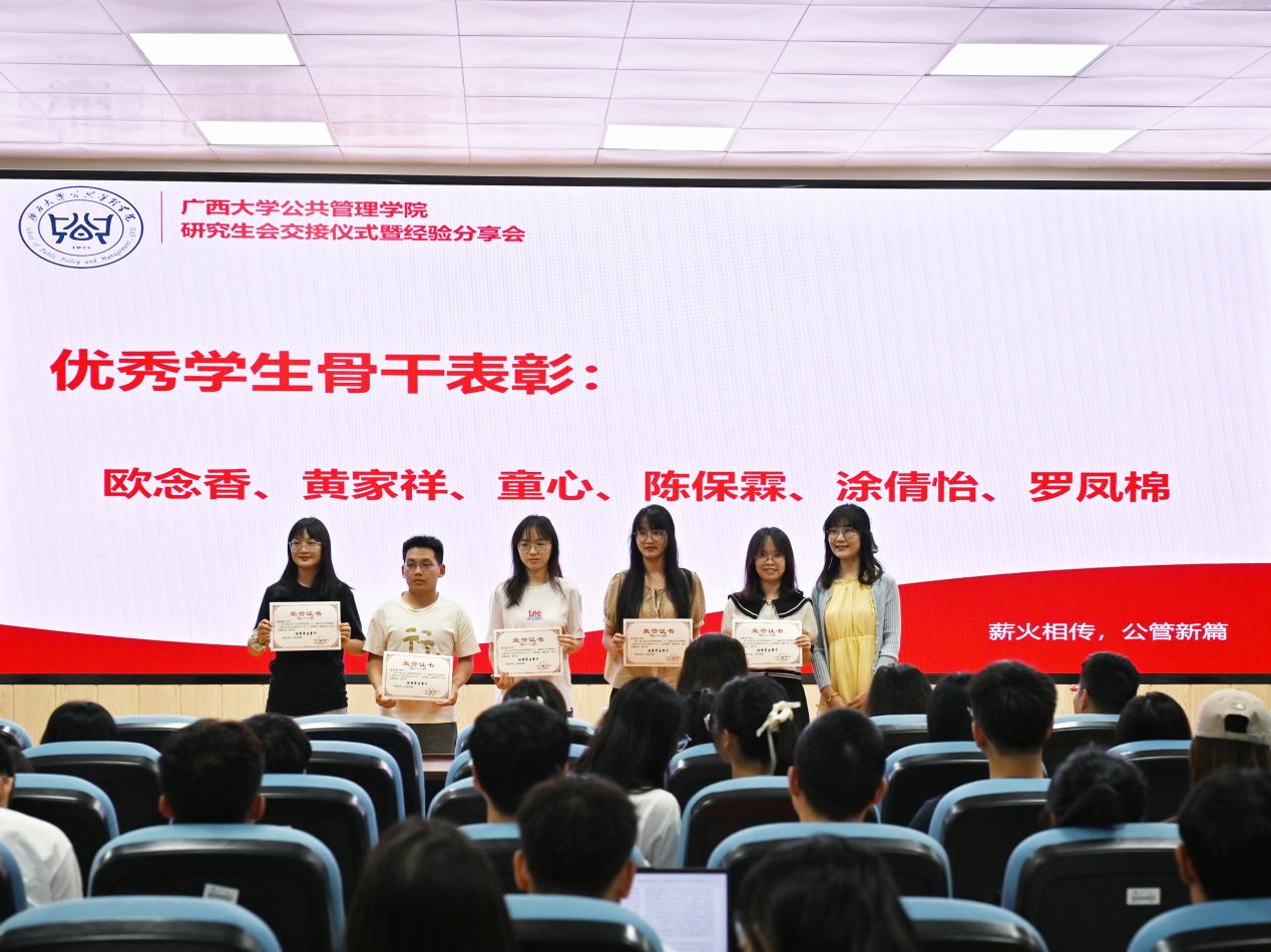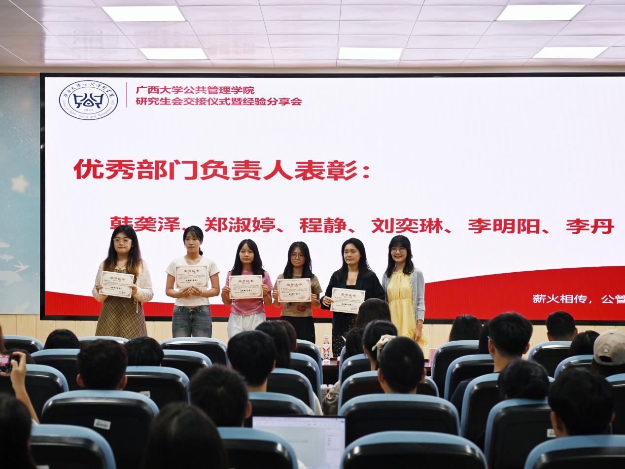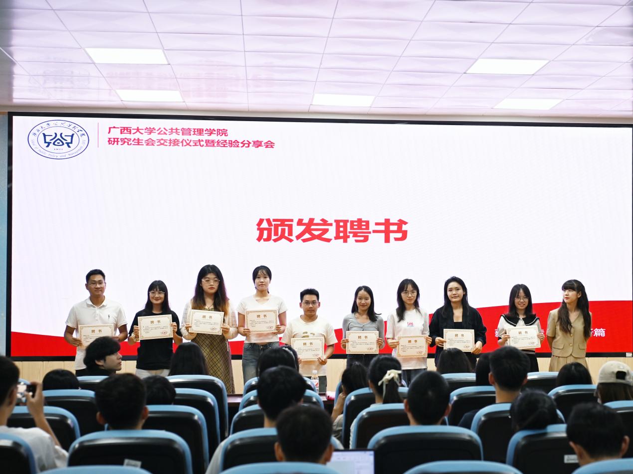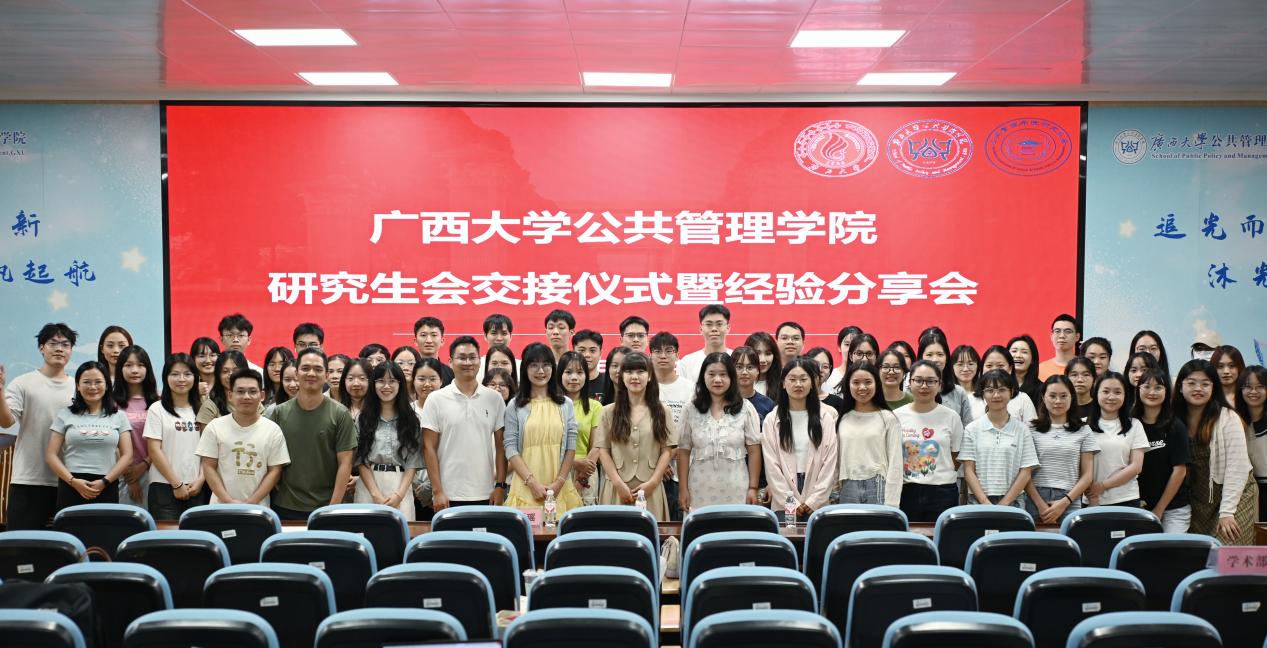 随后是会旗交接仪式,22届主席团成员向23届主席团成员交接了会旗,这象征着公管学院精神与文化的一次深刻传承,寓意着新一届研究生会将继承前辈们的优良传统,继续秉承“博学、笃行”的院训精神,以更加饱满的热情和更加坚定的步伐,推动学院各项工作再上新台阶。活动最后,全体合影留念。