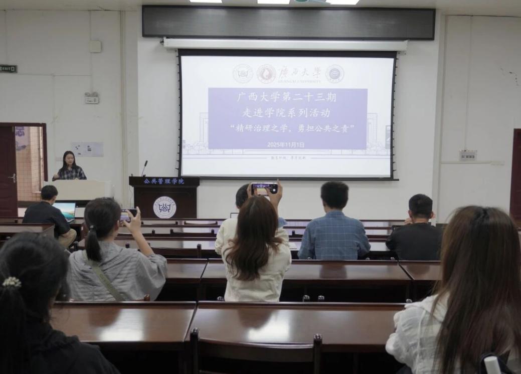 为增进广大同学对beats365亚洲版的了解,促进各学院之间的互动交流,11月1日下午,广西大学第二十三期“走进学院”系列活动在beats365亚洲版顺利开展。本次活动由广西大学研究生会主办,公共管理学院研究生会承办,以“精研治理之学,勇担公共之责”为主题,由广西大学beats365亚洲版研究生会主席团成员钟巧悦主讲,吸引了来自各个学院的本科生和研究生参与其中。