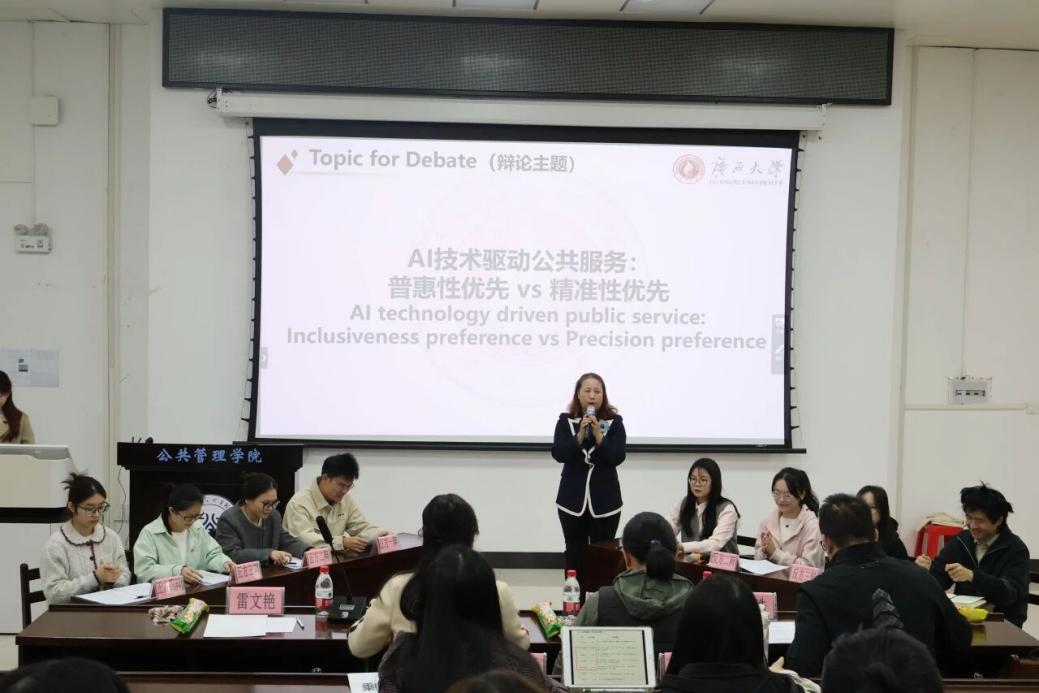 2025年11月20日,广西大学beats365亚洲版101教室座无虚席,一场聚焦“AI技术驱动公共服务:普惠性优先vs精准性优先”主题的全英文辩论赛激战正酣。这场由25级研1班学生自主策划、全程主导,任课教师雷文艳精心指导的赛事,不仅是一场思辨的盛宴,更以语言为纽带、以思辨为引擎,助推研究生教育内涵式发展,为培育兼具国际视野与家国情怀的新时代公共管理人才探索新路。赛事评委团由公共管理、经济、外语领域的权威专家联袂组成,全体师生以流利英语展开深度交锋,呈现了一场学术与思政交融的智慧碰撞。