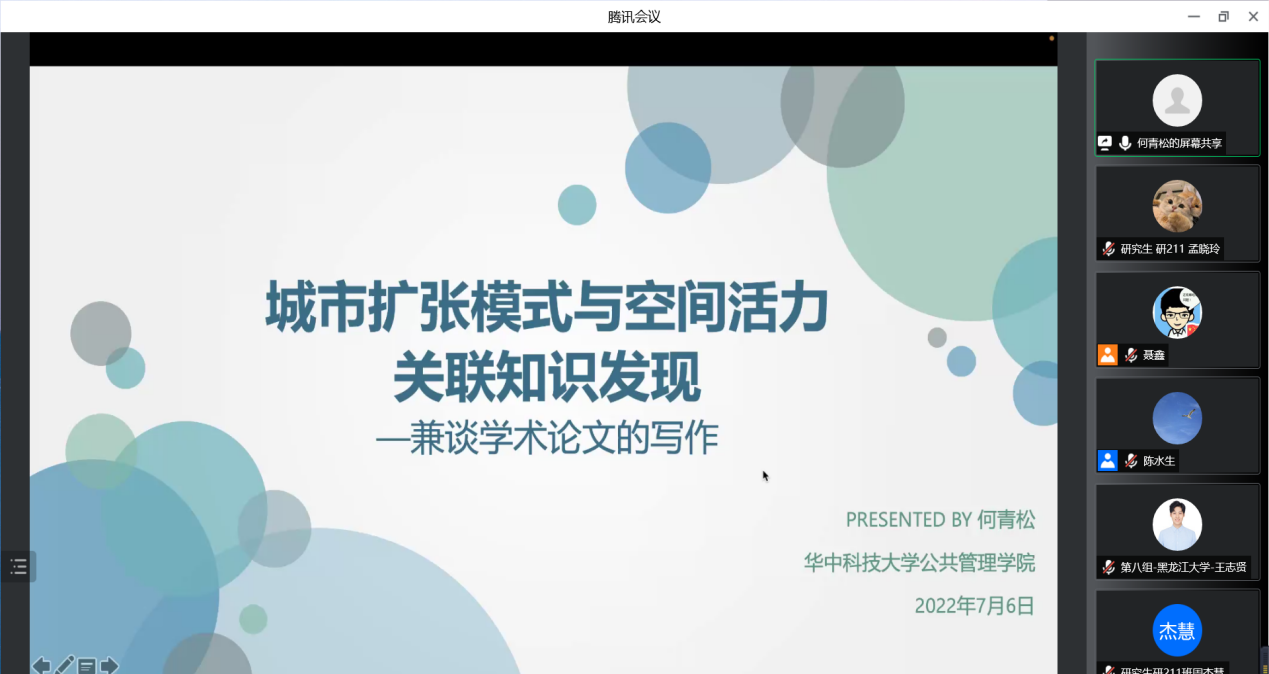 6日,我院举行了三场学术讲座,讲座以线上会议的形式举行,分别邀请了复旦大学教授陈水生、华中科技大学研究员何青松、浙江大学研究员吴佳雨作主题为《行政管理的学科发展及学习规划建议》、《城市扩张模式与空间活力关联知识发现—兼谈学术论文的写作》、《城市绿色空间治理》的分享,我院党委书记聂鑫教授主持会议,全体夏令营营员及学院多名老师、研究生参加本次学术讲座。