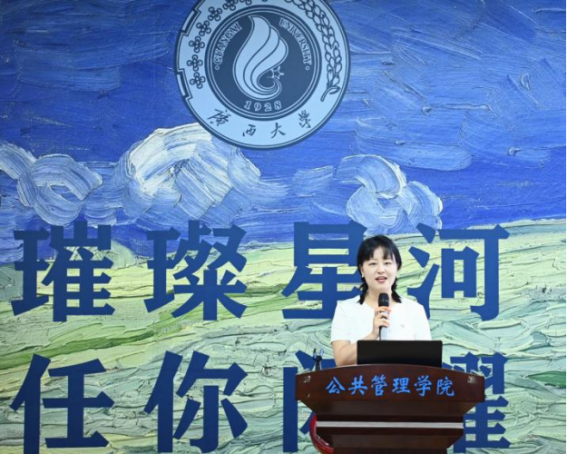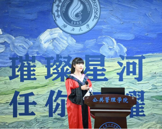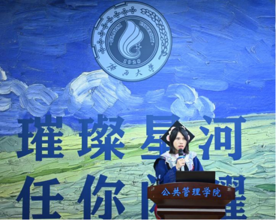 在校生代表刘姣姣回顾了学长学姐们在西大度过的岁月,对他们在学业和生活上给予的无私帮助表示了感激。她表示,学长学姐们的成就不仅彰显了个人才华和努力,更为在校生们树立了榜样,激励着他们不断追求卓越,并希望他们在未来的生活中繁花似锦,再相逢依旧如故。