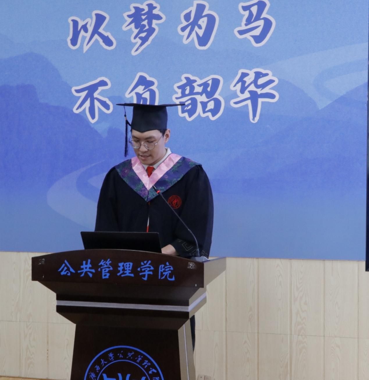 本科生代表陈律铭对他的四年学习生涯进行回望,展现出公管学子向下深扎实根,在火热实践中锤炼实干本领;向上奋力生长,与新时代同向同行的良好精神风貌。他呼吁毕业生们立报国强国大志向,做挺膺担当奋斗者,以青春、奋斗之我为强国建设和民族复兴伟业贡献青春力量。