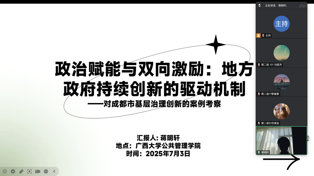 “公共政策案例解剖室”在学院404教室举行,孟群助理教授以“基层政府政策创造性执行研究”为主题进行分享。她以生动案例为导入,引出政策如何有效执行的研究问题,并阐释了“创造性”“创新性执行”等概念。她强调基层政府创造性执行需兼顾中央与地方关系、政策统一与灵活性,引发了同学们的诸多思考。
