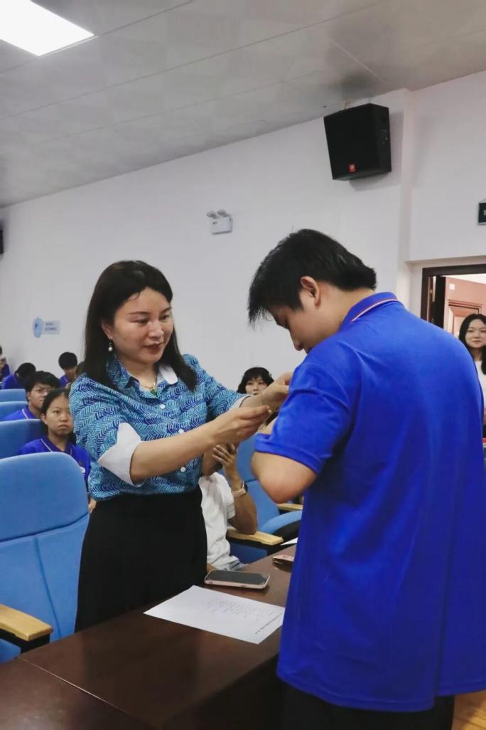 典礼上,我院举行校徽佩戴仪式,院领导老师为新生代表佩戴校徽,代表着新一届公管学子在广西大学的新征程正式开启,他们将发扬校训、院训精神,以昂扬上进的青春姿态投入到全新的学习生活中去。