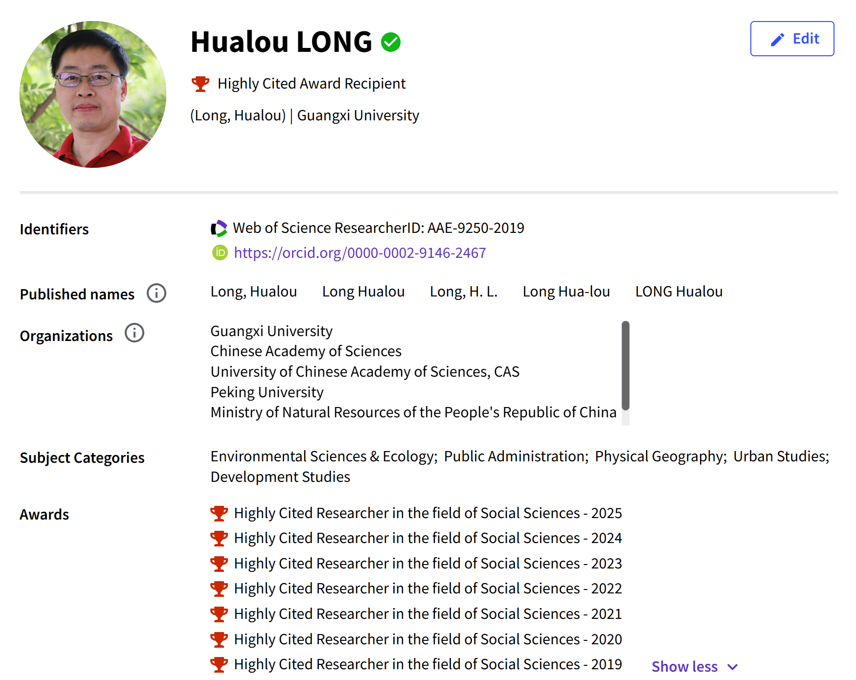 继2019年入选该榜单以来,我院土地资源管理系龙花楼教授再度连续入选社会科学(Social Sciences)领域的全球“高被引科学家”。2025年榜单中,龙花楼教授是广西大学在该榜单中唯一入选者。