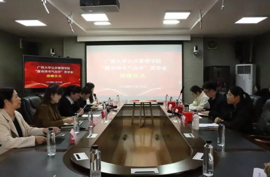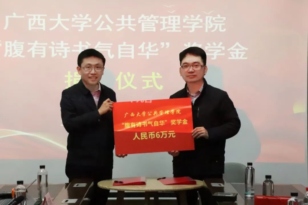 本次捐赠仪式在热烈而温馨的氛围中圆满结束。“腹有诗书气自华”奖学金的设立,凝聚了李林颖、李佳洁和邱咏茵三位爱心人士饮水思源的深厚情谊,更生动诠释了他们作为新时代青年干部向上向善的崇高品格。这份承载着关爱与期许的善举,将激励更多公管学子潜心向学,将“诗书”内化为精神底色,将“服务社会”外化为人生追求,在为奋力谱写中国式现代化广西篇章的进程中书写人生华章。
