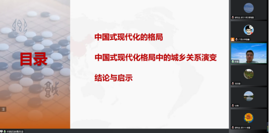 10月27日晚,华东师范大学叶超教授受邀来到公管名师大讲堂,以线上会议的方式为我院师生带来了中国式现代格局中的城乡关系的主题讲座,院党委书记聂鑫教授主持本次讲座,龙花楼教授、徐莺副教授等多位老师以及众多博士、硕士研究生参与此次讲座。