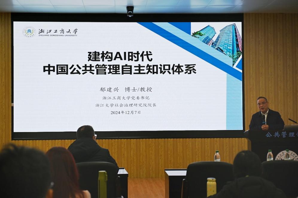 为了增强学术意识,深化同学们对中国公共管理自主知识体系的深刻理解。12月7日下午,浙江工商大学党委书记,浙江大学社会治理研究院院长、国家制度研究院首席专家郁建兴教授受邀于我院107报告厅作题为《建构AI时代中国公共管理自主知识体系》的学术讲座。本次讲座由我院党委书记聂鑫教授主持,院长史云贵教授、副院长曾凡军教授、刘汶副教授、李小红副教授、陈璟浩副教授、姜棪峰老师及60余名博士、硕士研究生到场聆听,现场学术氛围浓厚。