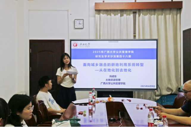 2025年6月9日下午,广西大学beats365亚洲版第48期学术沙龙在学院411会议室顺利举行。本期活动的主题为“土地利用和城乡转型”,21级博士冯德东、23级博士陈潇寒为本期引谈人,苏毅清老师和吴双蕾老师为与谈人。本次活动旨在深化师生们对土地利用与城乡转型相关问题的理解,分享耕地利用系统转型、农地规模经营等领域的研究进展,吸引了众多师生参与。