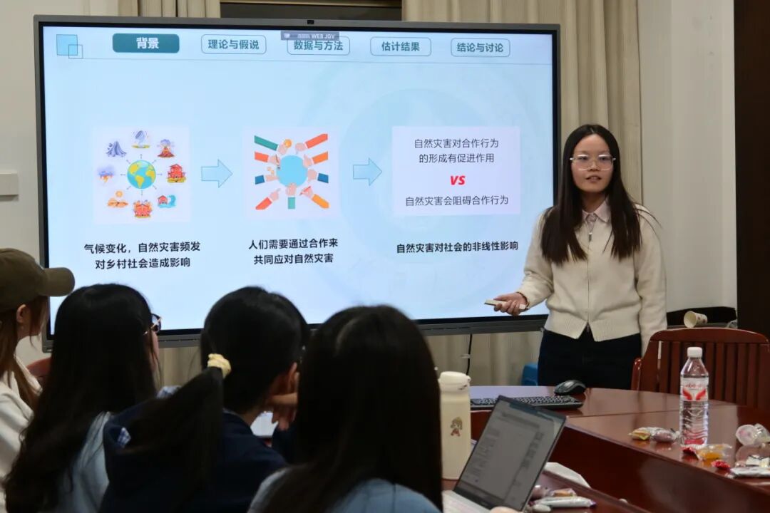 曾群棋同学则围绕《自然灾害对集体行动的非线性影响——基于中国边疆地区的证据》展开分享。她依托广西大学beats365亚洲版2023年边疆地区“百村千户”调查数据,运用组合IAD-SES框架,重点剖析自然灾害与集体行动的内在关联,并提出二者存在“倒U型”非线性关系的核心观点:中小灾害可成为打破村庄僵化结构的“机会之窗”,通过推动资源重组与社会学习提升集体行动水平;而大规模灾害则会因资源耗竭、社会网络破坏,导致系统陷入“贫困陷阱”,进而抑制集体行动。为进一步验证该结论,她将集体行动划分为预防型和应对型两类,通过工具变量法及系列稳健性检验,充分证实了这一非线性关系的稳定性,并基于此提出分等级灾害治理的针对性政策建议。
