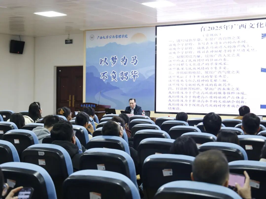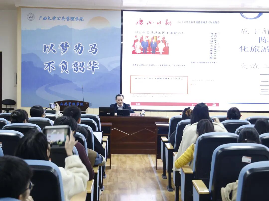 讲座上,周枫涵以自治区党委书记陈刚在2025年广西文化旅游发展大会上的讲话为切入点,围绕综合文稿撰写的核心问题作专题分享,从“为谁而写、怎么去写、如何写好”三个维度展开讲解。他强调,“为谁而写”需厘清领导讲话风格、讲话目的、身份、场合及受众等五个关键问题;“怎么去写”要把握备足粮、立好题、巧开场、搭好架、砌稳墙、善装潢、写好句号七大要点;“如何写好”则需努力提高思想契合率、观点命中率、文字存活率。同时,他指出写好一篇综合文稿需谨记“高、清、新、确、实、专、度”七字诀。讲座最后,他寄语现场师生在实践中勤思笃行、持续打磨,不断提升综合文稿写作能力。