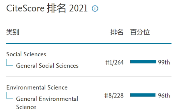 据悉,Journal of Industrial Ecology由耶鲁大学(Yale University)创办,目前由国际产业生态学会(ISIE)主管。Journal of Industrial Ecology在2021年CiteScore为12,在一般社会科学中连续多年排名第一(1/264),一般环境科学排名第八(8/228),年研究论文发文量120篇。