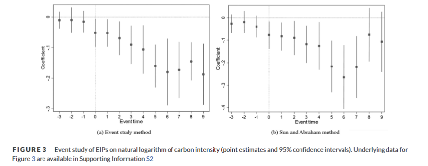 论文内容:生态工业园区(EIPs)是推进中国绿色转型的主要载体。作为一项重要的环境规制政策工具,EIPs是否实现了经济与环境效益的“双赢”,仍没得到严谨的检验。本研究使用Staggered DID评估EIPs对试点城市低碳发展的影响。实证结果显示,EIPs有助于实现中国的低碳发展。具体来说,EIPs使试点城市的碳强度平均降低了7.2%。充分考虑理论计量关于双向固定效应Staggered DID的Heterogeneous Treatment Effects可能存在的偏差后,基于Goodman-Bacon Decomposition,Doubly Robust DID和Sun and Abraham’s Estimation的多重检验结果依旧稳健。进一步分析发现,EIPs推动了技术创新,刺激了波特效应,并优化了产业结构。