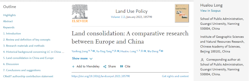 该论文题为《Land consolidation: A comparative research between Europe and China》,发表在土地科学领域权威期刊《Land Use Policy》(JCR 1区,IF 2021=6.189;中科院分区:法学1区Top)。本文是第一次尝试对整个欧洲和中国的土地整治进行系统的对比研究,为土地整治的相关研究和发展提供了一个更广泛的视角,并在此基础上为进一步推动欧洲地区和中国土地整治的发展提出了策略与建议。