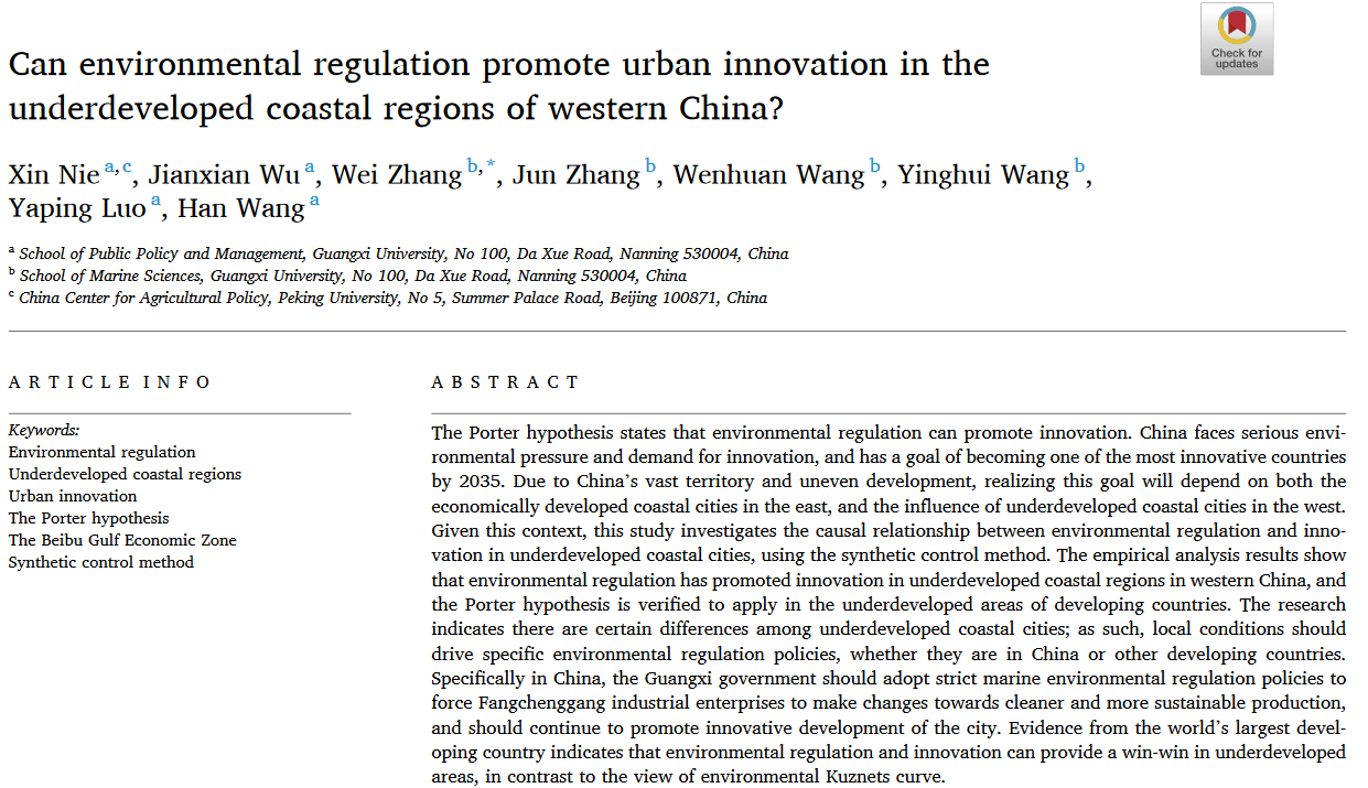 聂鑫在Marine Policy发文检验环境规制能否促进中国西部沿海欠发达地区城市创新?