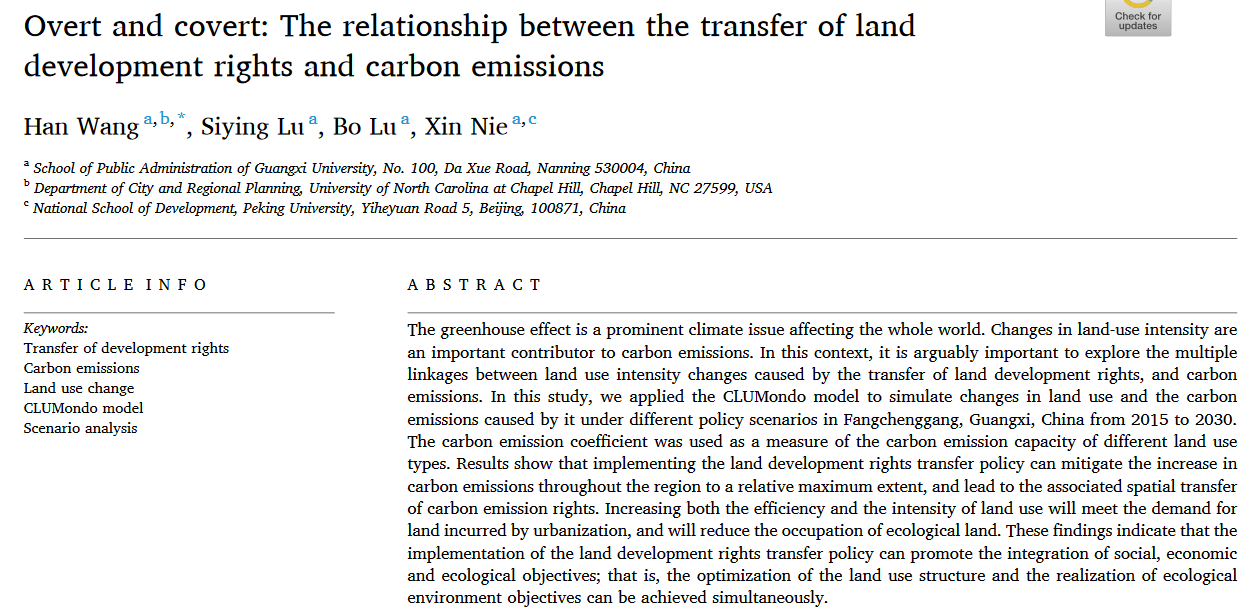 汪晗在Land Use Policy发文检验显性与隐性:土地开发权流转与碳排放的关系