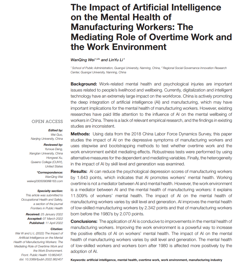 魏万青在Frontiers in Public Health发文探讨人工智能对制造业工人心理健康的影响