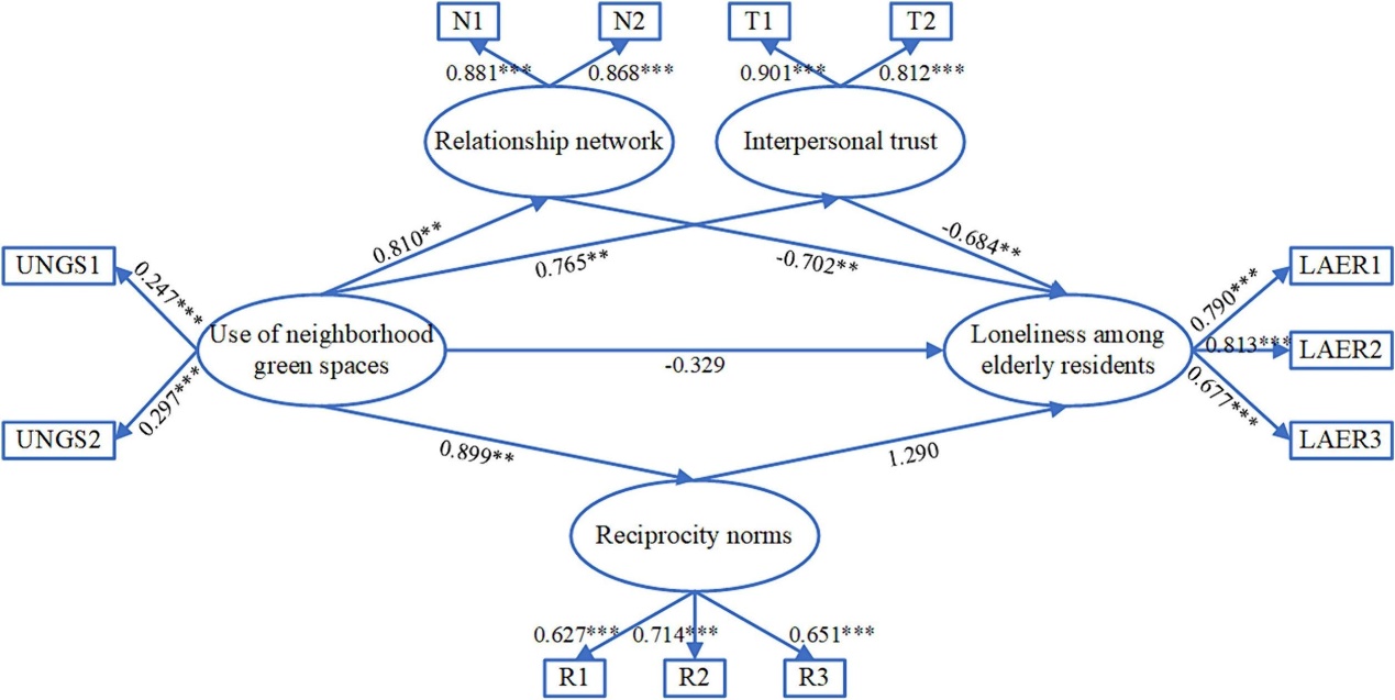 同时,研究进一步证实了社会资本在社区绿色空间缓解老年孤独感中扮演了完全中介的角色。其原因可以归结为两个方面:一方面,完全中介效应体现了社会资本所具有的综合解释力,它能够通过建立社交网络、提供情感与物质支持、促进信息流动与分享、增强社区参与等方式全方位的影响老年人的孤独感。另一方面,社会资本的完全中介作用也反映了社区绿色空间的影响总是间接的,通过空间构建起来的密切联系、充满关怀与温情的社会才是缓解孤独感的本质。这就使得在制定政策的时候,要考虑更多的关联,由此才能体现出公共空间的作用。