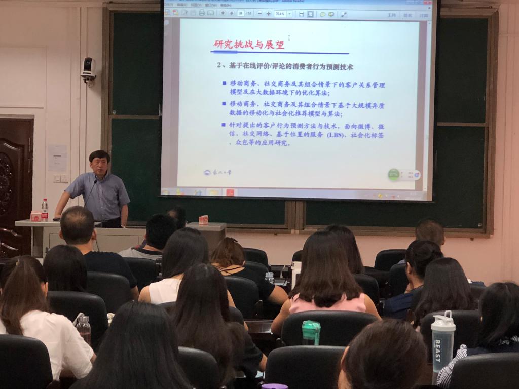 2018年5月27日上午八点三十分,我院荣幸邀请国家杰出青年基金获得者、东北大学工商管理学院副院长樊治平教授来我院做学术报告,为我们讲解基于在线评价/评论的管理决策问题研究,李登峰教授、beats365亚洲版聂鑫教授和汪晗副教授以及数信学院刘芳教授一同参加此次讲座,吸引各个学院的研究生前来学习。