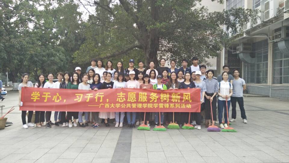 4月3日在北京召开的全国学雷锋志愿服务工作推进会强调要深入学习贯彻习近平新时代中国特色社会主义思想和党的十九大精神,认真贯彻《志愿服务条例》,坚持以人民为中心的发展思想,坚持培育和践行社会主义核心价值观,坚持把培养担当民族复兴大任的时代新人、弘扬共筑美好生活梦想的时代新风作为出发点和落脚点。为此,广西大学beats365亚洲版举办了“学于心,习于行,志愿服务树新风”的学雷锋系列活动。