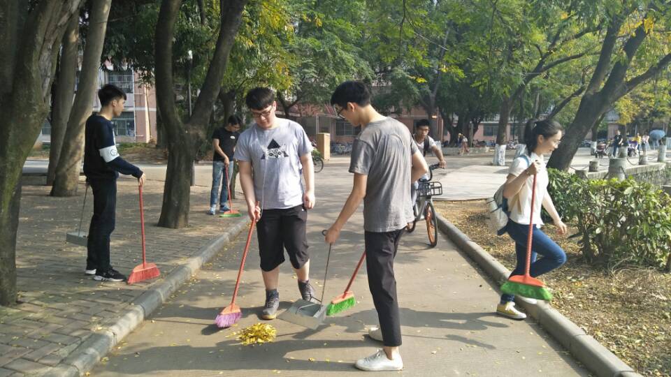 活动前,同学们准备了扫帚、簸箕、抹布等工具,根据清扫区域进行分组;,一个多小时的活动期间,同学们各司其职、相互合作并一直充满热情的打扫广场和湖边小路的烟头、落叶等垃圾,并用抹布搽干净了花坛外围,给路人提供了一片干净的休息地。