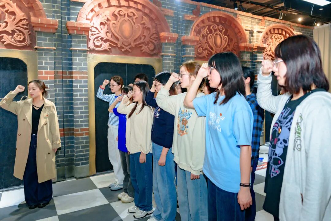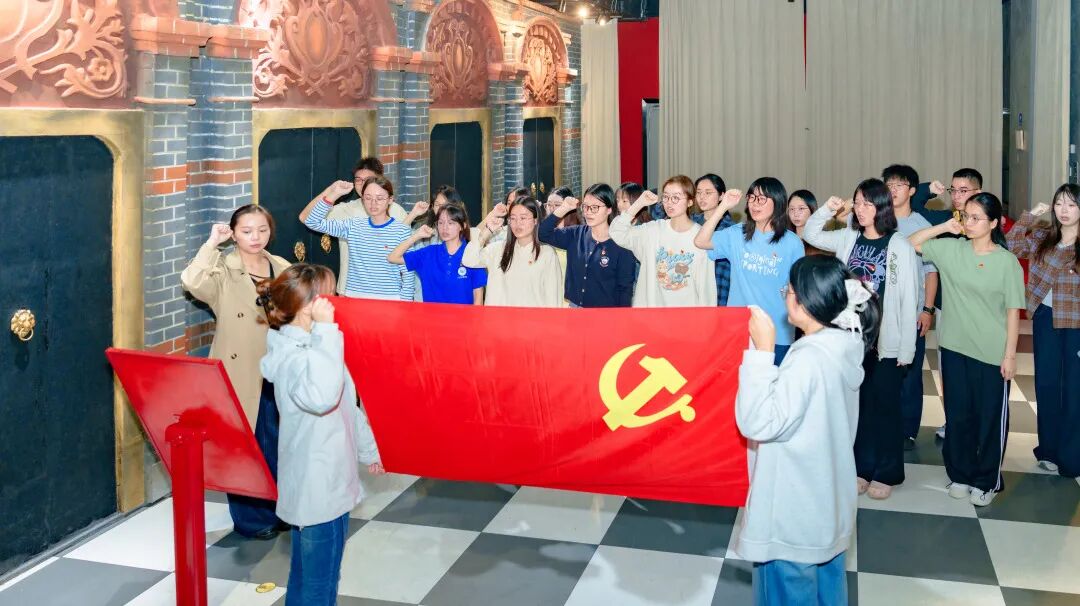 沉浸式体验结束后,全体党员面向党旗整齐列队,举起右拳、庄严宣誓。重温一次入党誓词,支部党员深情回望入党初心使命,在庄严肃穆的氛围中提升党性修养。