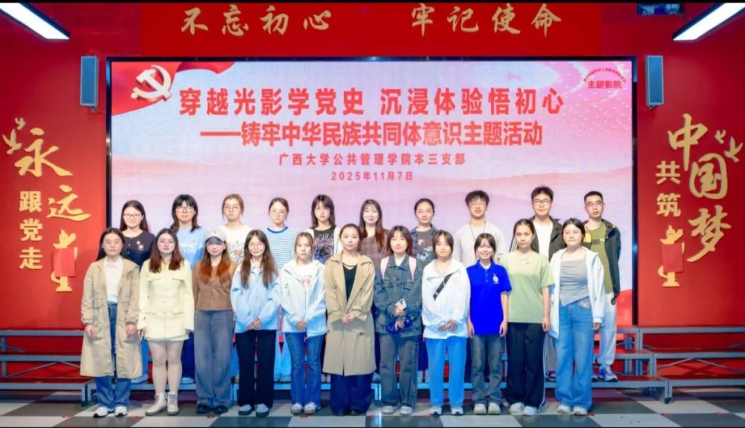 为创新模式开展形式多样的主题党日活动,促进党史学习教育常态化长效化,深化铸牢中华民族共同体意识教育,11月7日,我院本科生第三党支部组织全体党员前往南宁盛天上影电影党建教育基地,开展以“穿越光影学党史 沉浸体验悟初心 ”为主题的党日活动,让红色教育从“被动接受”变为“主动体验”。